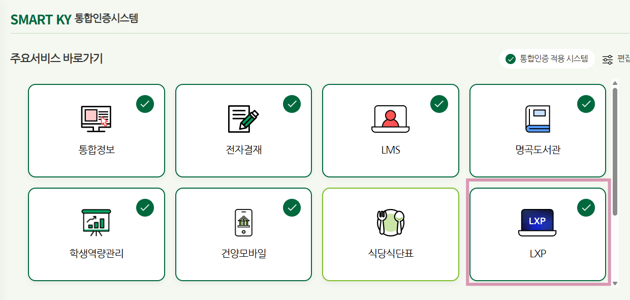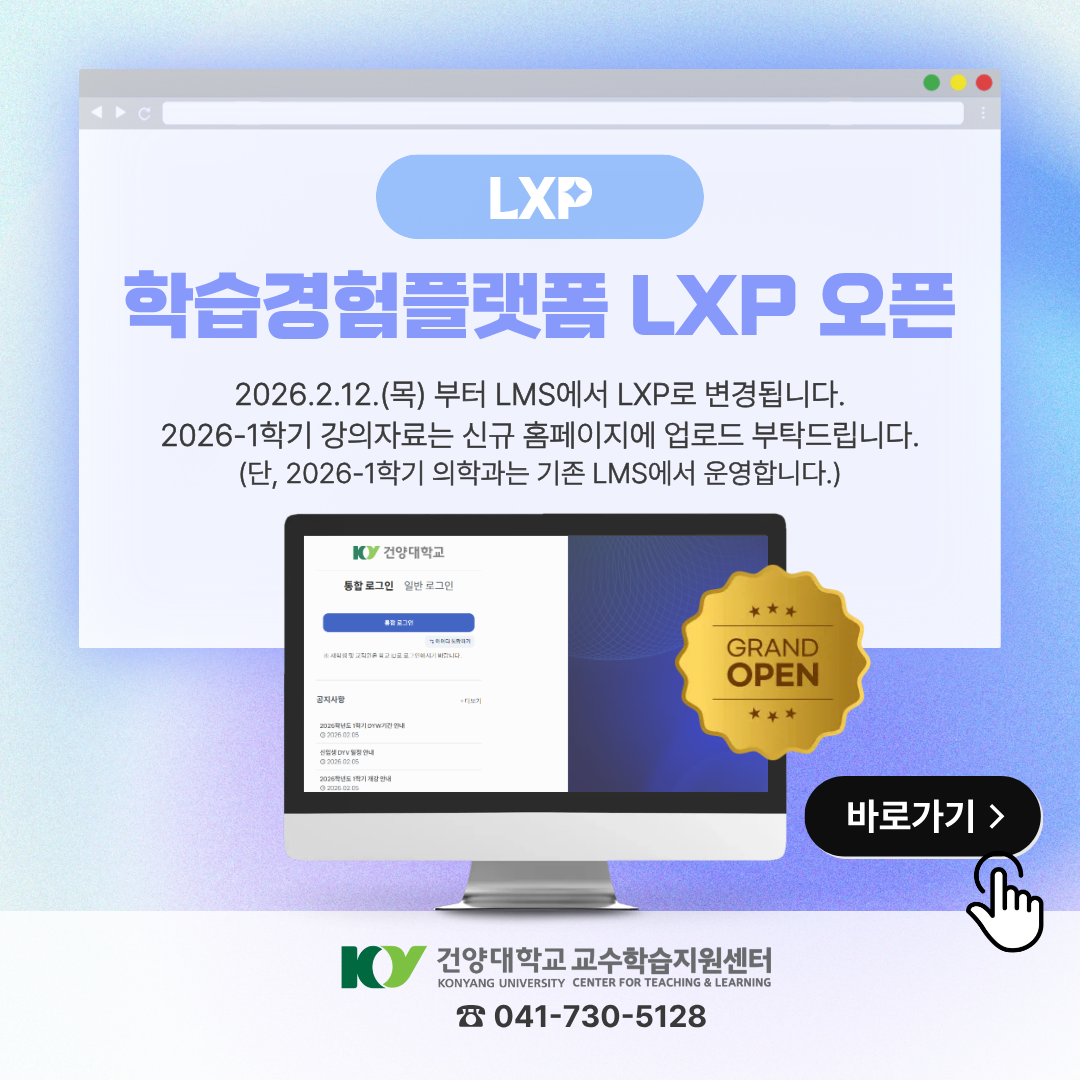 2026.2.12.(목)부터 건양대학교 학습관리시스템은 LMS에서 LXP로 변경됩니다. (구)LMS에서는 지난 학기 자료를 다운로드 해주시고, 2026-1학기 강의자료 및 영상은 LXP에 업로드 가능합니다. 교수님 대상으로 사용자 비대면 교육이 진행되고 있습니다. *사용자 교육(교원) 신청하러가기 : https://forms.cloud.microsoft/r/CSbETBRCCj *접속방법 : 스마트키 로그인 후 "LXP"아이콘 클릭