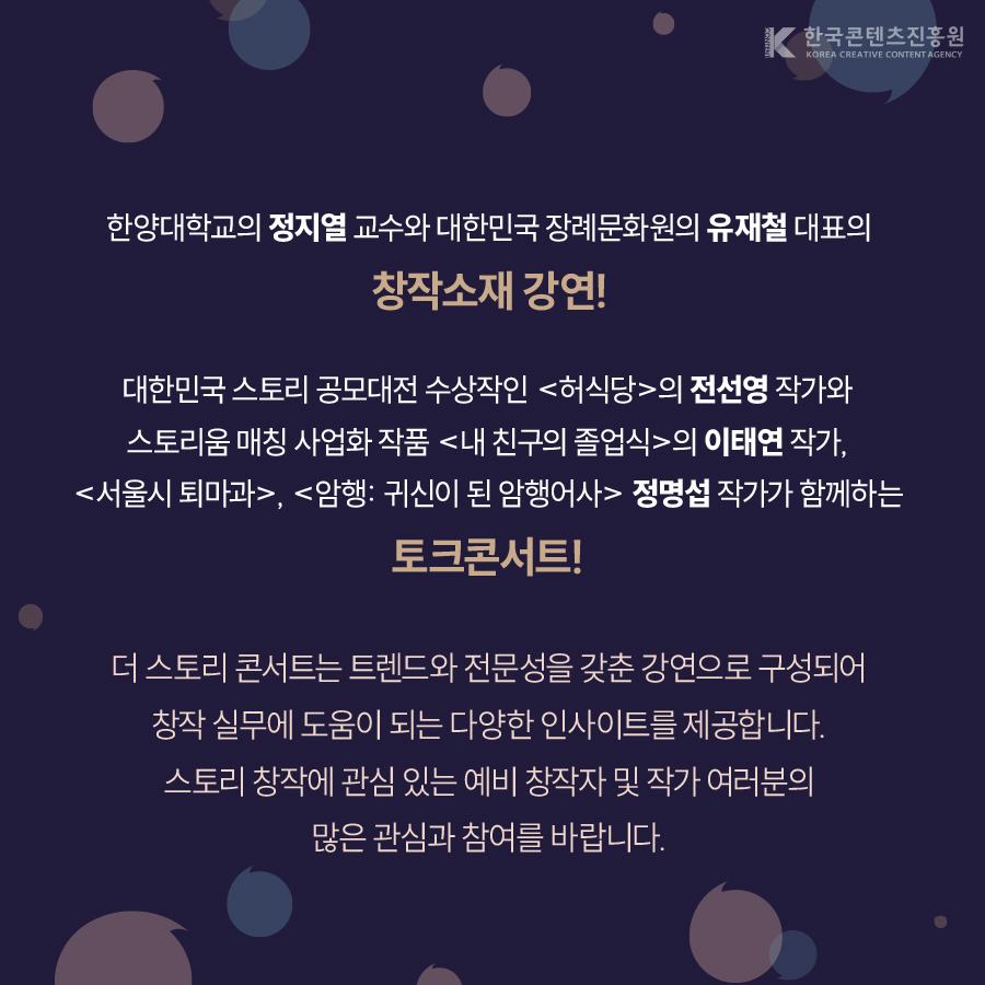 문화체육관광부와 한국콘텐츠 진흥원이 주최·주관하는 <2025 더 스토리 콘서트>에 초대합니다! ? 창작의 첫 걸음을 떼려는 예비창작자 ? 현직 작가들의 생생한 경험과 노하우를 배우고 싶은 분 ? 창작물을 사업화 하는 과정에 대한 궁금증이 있는 분 예비·신진 창작자분들이 궁금했던 모든 것들을 작가님들의 경험담을 통해 해소시켜드립니다. 참가 신청 페이지? https://forms.gle/KHdEA83T3qdTTbvR6